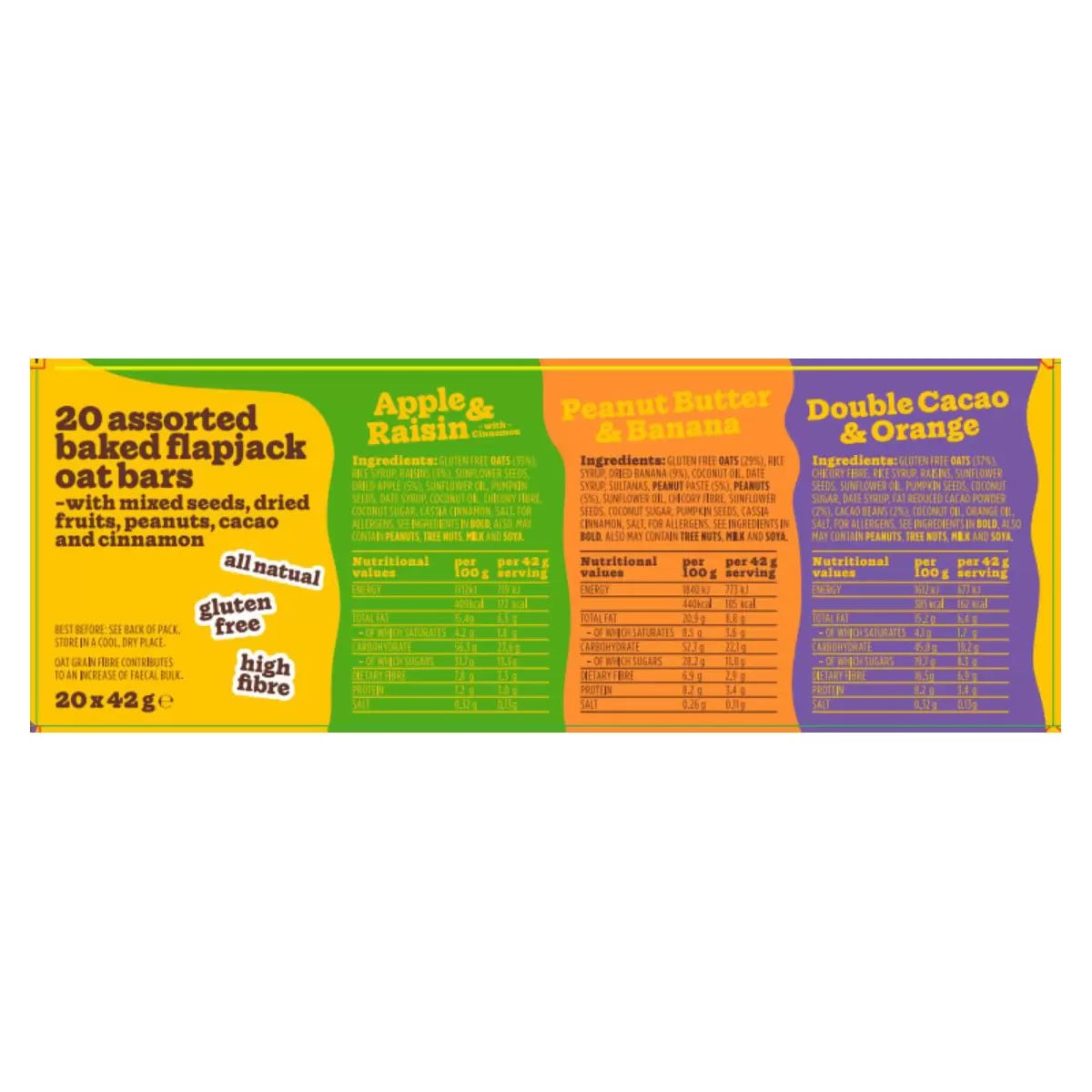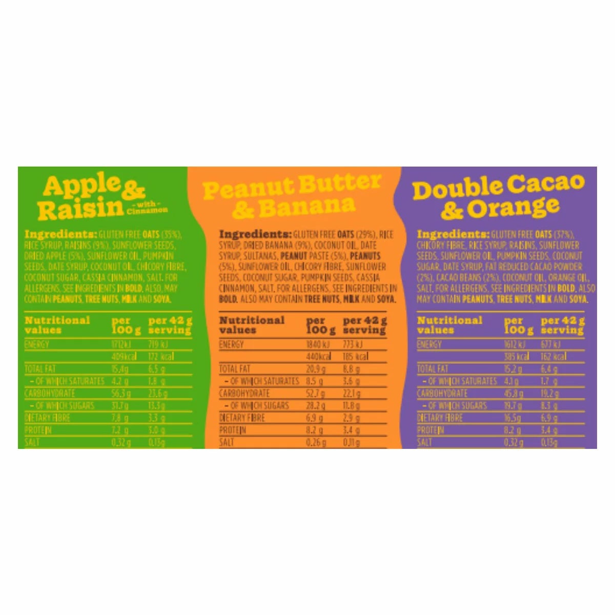 Gluten Free Oats (29%), Rice Syrup, Dried Banana (9%), Coconut Oil, Date Syrup, Sultanas, Peanut Paste (5%), Peanuts (5%), Sunflower Oil, Chicory Fibre, Sunflower Seeds, Coconut Sugar, Pumpkin Seeds, Cassia Cinnamon, Salt.