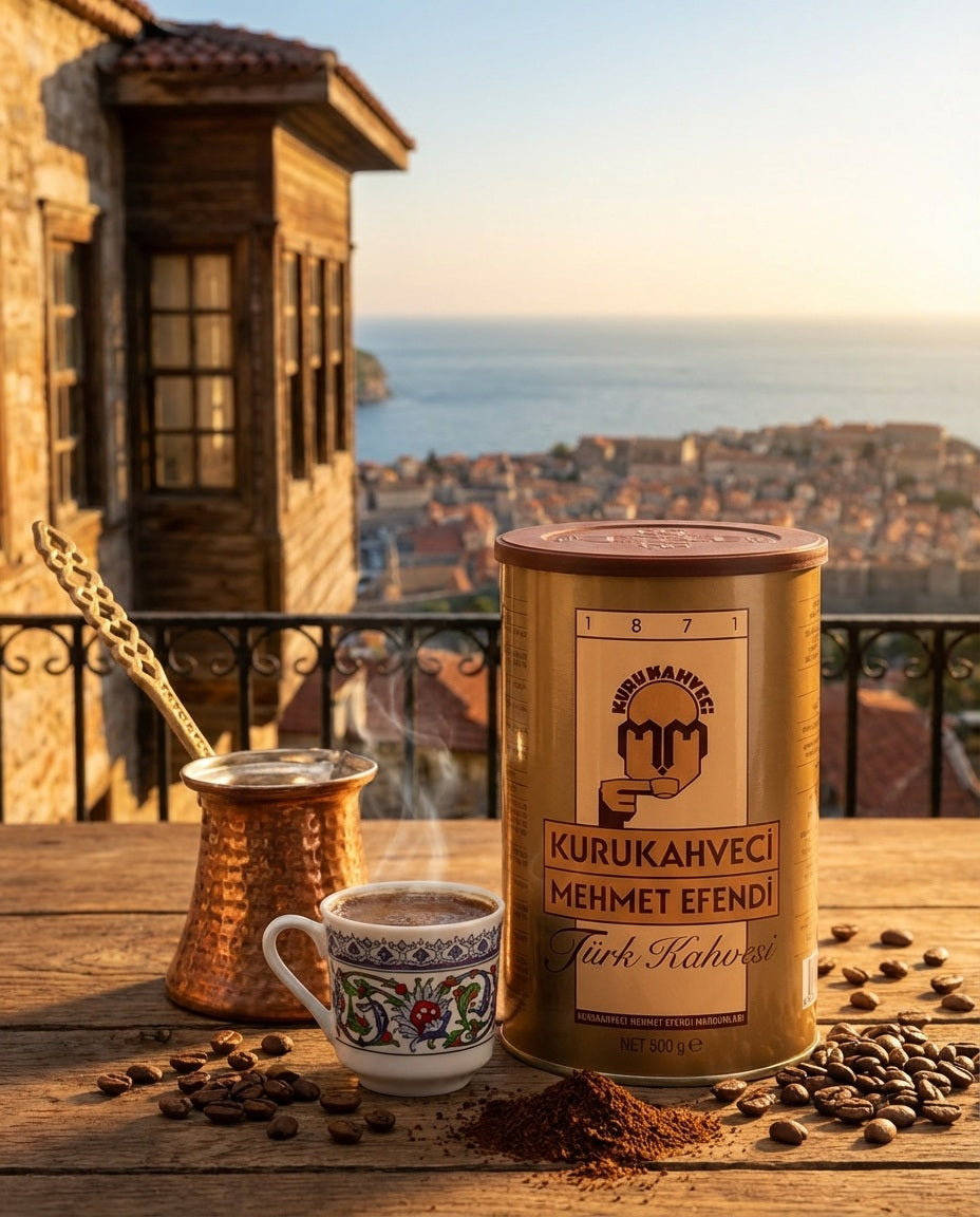 Mehmet Efendi Turkish Coffee 500g is a premium, finely ground traditional coffee crafted with more than a century of expertise. Packaged in its signature golden-brown bag, this iconic blend represents the authentic flavor and aroma that generations of coffee lovers associate with true Turkish coffee. Each 500-gram pack contains meticulously roasted Arabica beans, ground to an ultra-fine powder that dissolves smoothly in water, creating the distinctive velvety texture and thick foam that define a perfect cup.