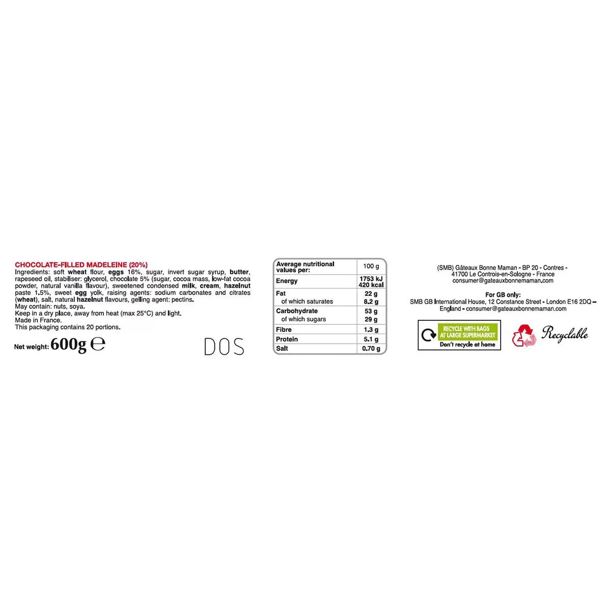Soft wheat flour, eggs (16%), sugar, invert sugar syrup, butter, rapeseed oil, stabiliser: glycerol, chocolate 5% (sugar, cocoa mass, low-fat cocoa powder, natural vanilla flavour), sweetened condensed milk, cream, hazelnut paste 1.5%, sweet egg yolk, raising agents: sodium carbonates and citrates (wheat), salt, natural hazelnut flavours, gelling agent: pectins.