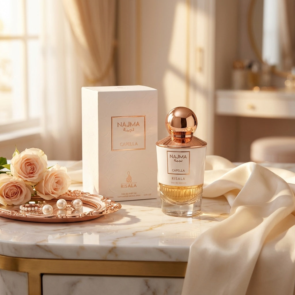 Discover the radiant elegance of Najma Capella by Risala — a refined oriental fragrance inspired by starlight and timeless beauty. This luxurious Eau De Parfum opens with luminous fruity and citrus accords that create an immediate sparkle. The heart reveals a graceful blend of soft florals and creamy sweetness, delivering a smooth and feminine character. As the fragrance settles, rich amber, warm vanilla, and sensual musk form a deep, long-lasting trail. Najma Capella is perfect for evening wear, special occasions, and those who love elegant, glowing perfumes with a modern oriental soul.