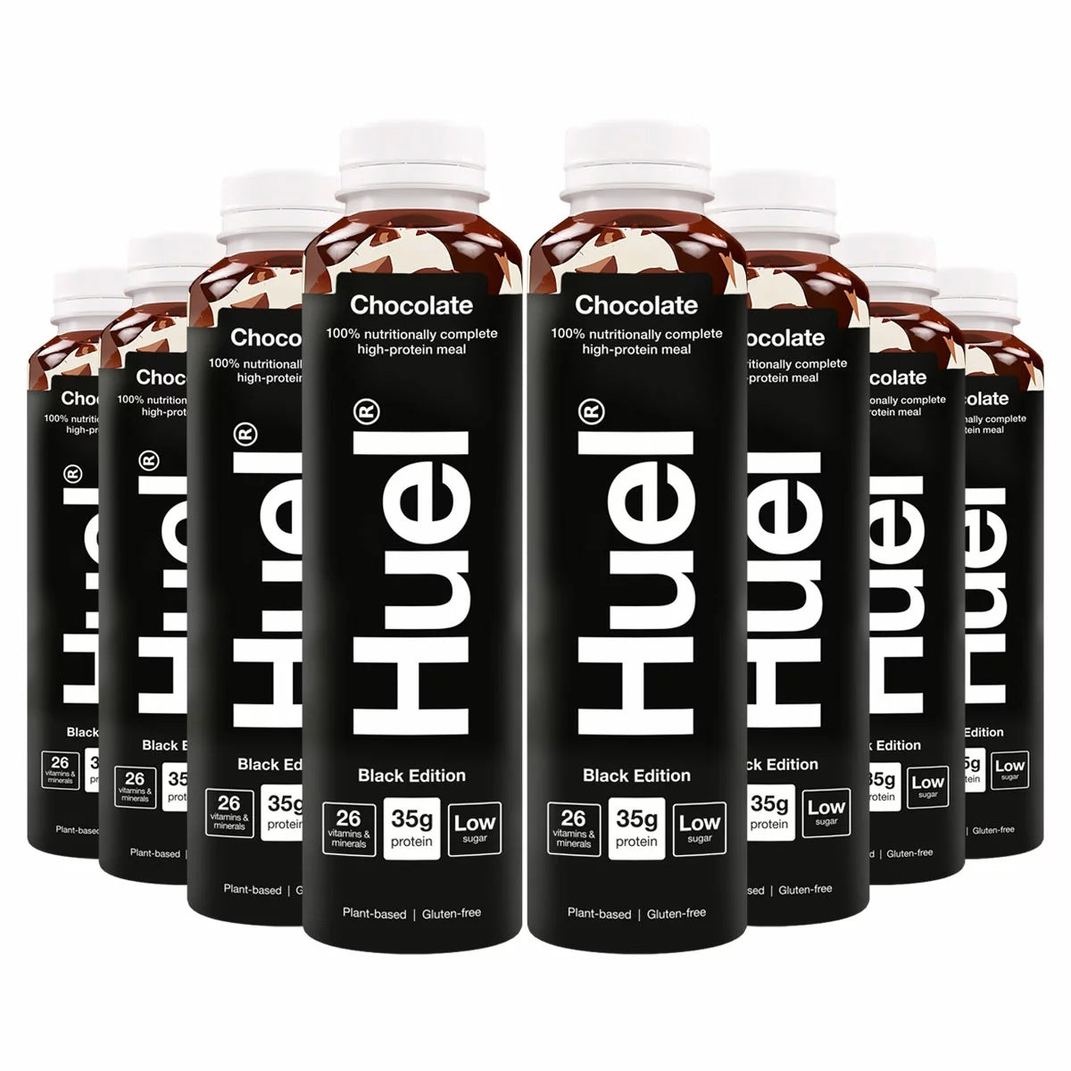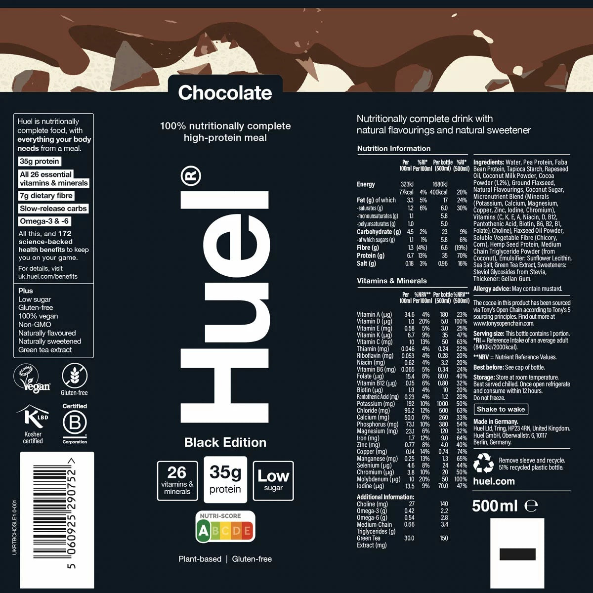 High-protein nutrition made effortless. Huel Black Edition Chocolate Ready-to-Drink delivers a nutritionally complete plant-based meal in a smooth chocolate shake. Each 500ml bottle provides around 35–40g protein, fibre, essential fats and 26 vitamins & minerals with lower carbohydrates than standard Huel. Vegan, gluten-free and low sugar, it’s ideal for busy lifestyles, gym recovery, commuting, travel or meal replacement — simply shake and drink for sustained energy and fullness.