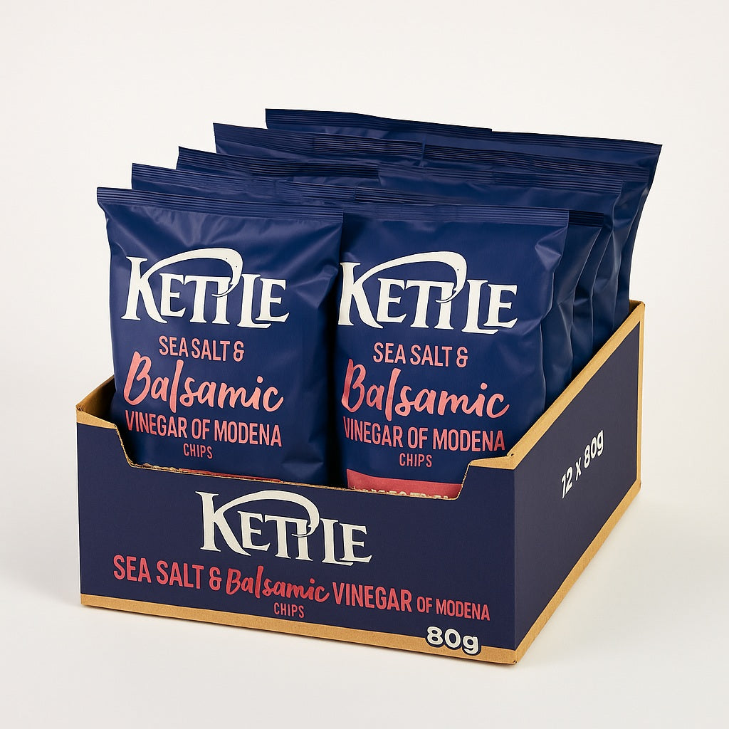 Kettle Hand Cooked Sea Salt & Vinegar Chips are thick-cut British potatoes, batch-cooked for that signature hard, satisfying crunch. The seasoning is not just standard vinegar powder — it’s sea salt plus real Balsamic Vinegar of Modena, which gives a deeper rounded tang with a touch of natural sweetness instead of a harsh acidic hit. You get salt, you get sharpness, but also a kind of mellow dark vinegar note that tastes more “gourmet deli” than “canteen crisp.”