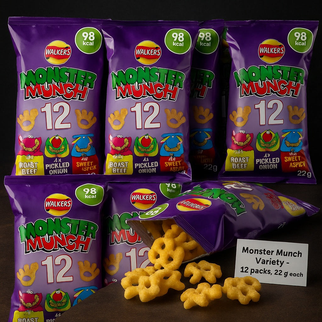 • 12 × Monster Munch Variety – ~22g each (4 Roast Beef, 4 Pickled Onion, 4 Sweet & Spicy / Flamin’ Hot)