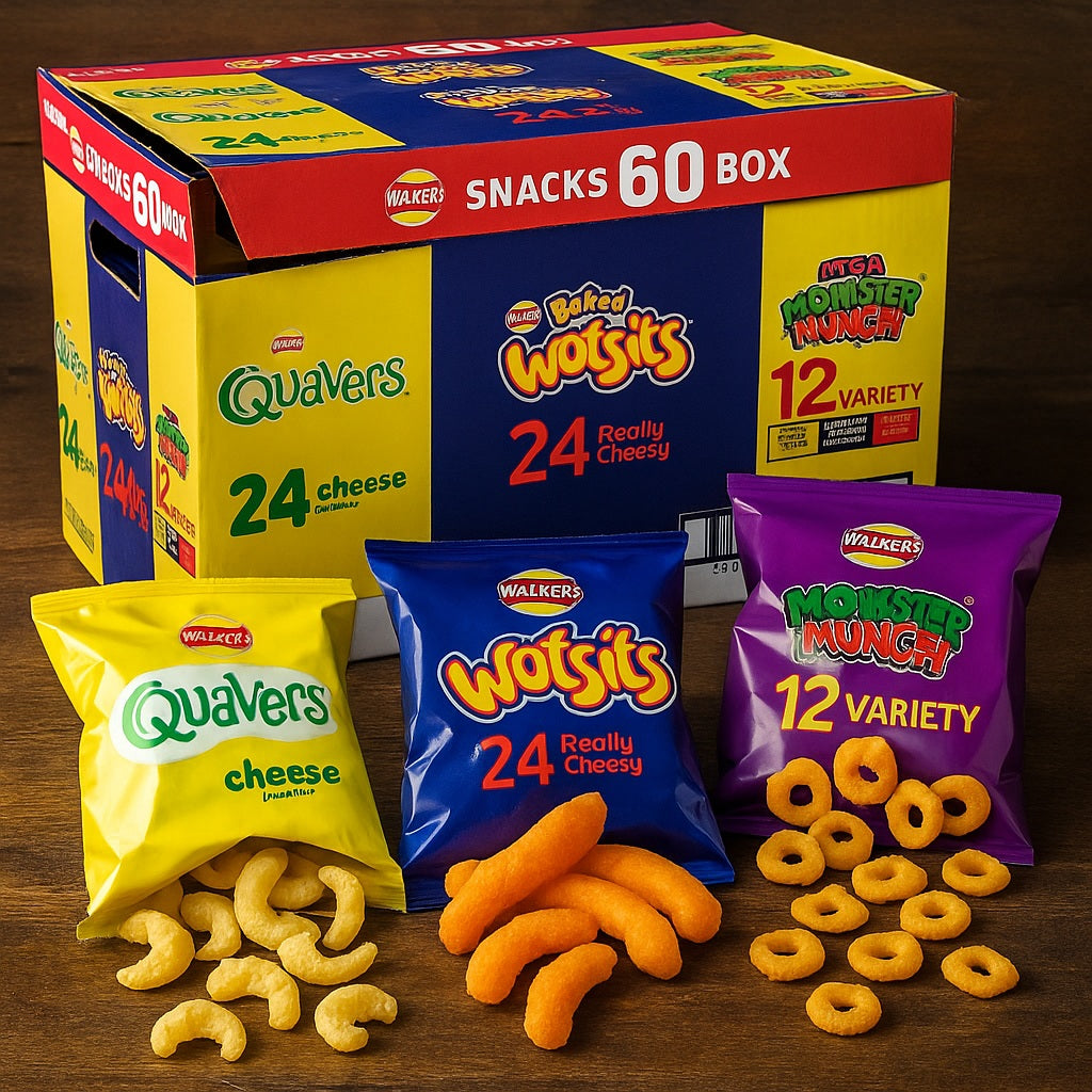 The Walkers Snacks 60 Box is a large, brightly coloured mixed-snack case containing 60 individual packs of some of Walkers’ most iconic British favourites. The packaging uses the trademark bold Walkers colour blocks—yellow for Cheese Quavers, deep blue for Really Cheesy Wotsits, and purple for Monster Munch—making the assortment instantly recognisable.